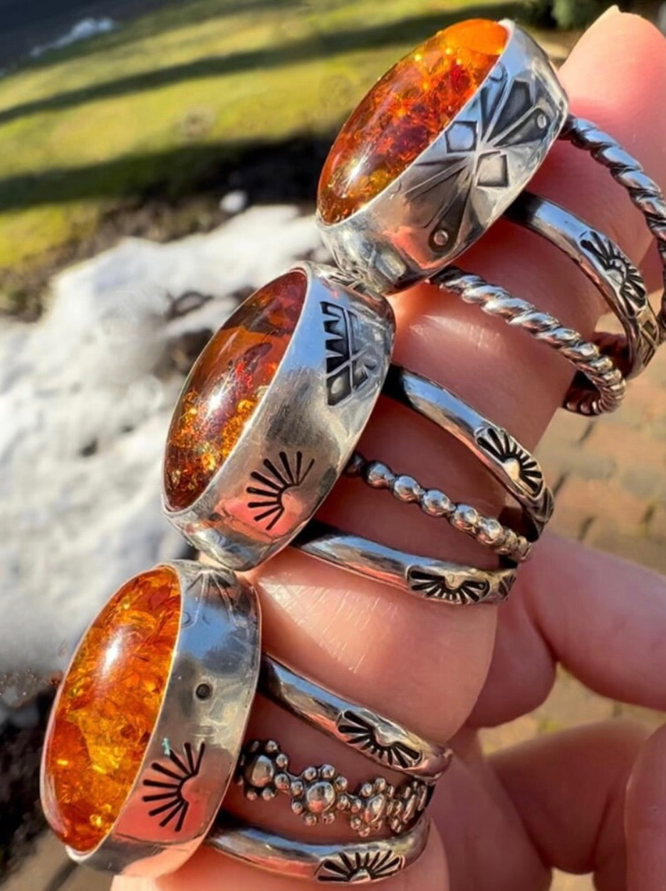 Another masterpiece from Denny. Beautiful amber with three bands and hand stamped bezel, comfortable to wear, amazing quality! Love it.....thank you Denny -Claudia
